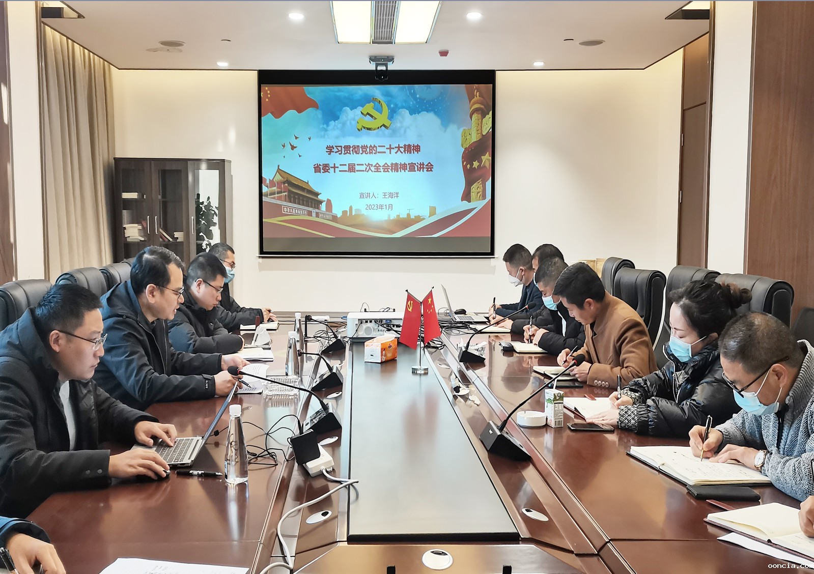 王海洋一行到幸福公司伊始,便首先组织ooncia幸福公司全体党员、经营班子及中层以上管理人员,学习贯彻党的二十大精神、宣讲省委十二届二次全会精神,他以自身的学习理解,从“三个深入领会、五个牢牢把握、六个不断强化”等方面,带领大家一起学习,并强调,此次的学习,是领学、是开始,学习贯彻党的二十大精神是一个常学常新、不断深化的过程。他要求,接下来,ooncia幸福公司要组织全员学、持续跟进学、融会贯通学、联系实际学,要精心组织、系统覆盖、全面深入,要坚持读原文、悟原理,多形式、分层次、全覆盖,领导干部带头学、全体员工参与学,要学以致用,把学习成果应用到工作实践中,用党的二十大精神指引指导我们在具体工作中攻坚克难、一往无前。