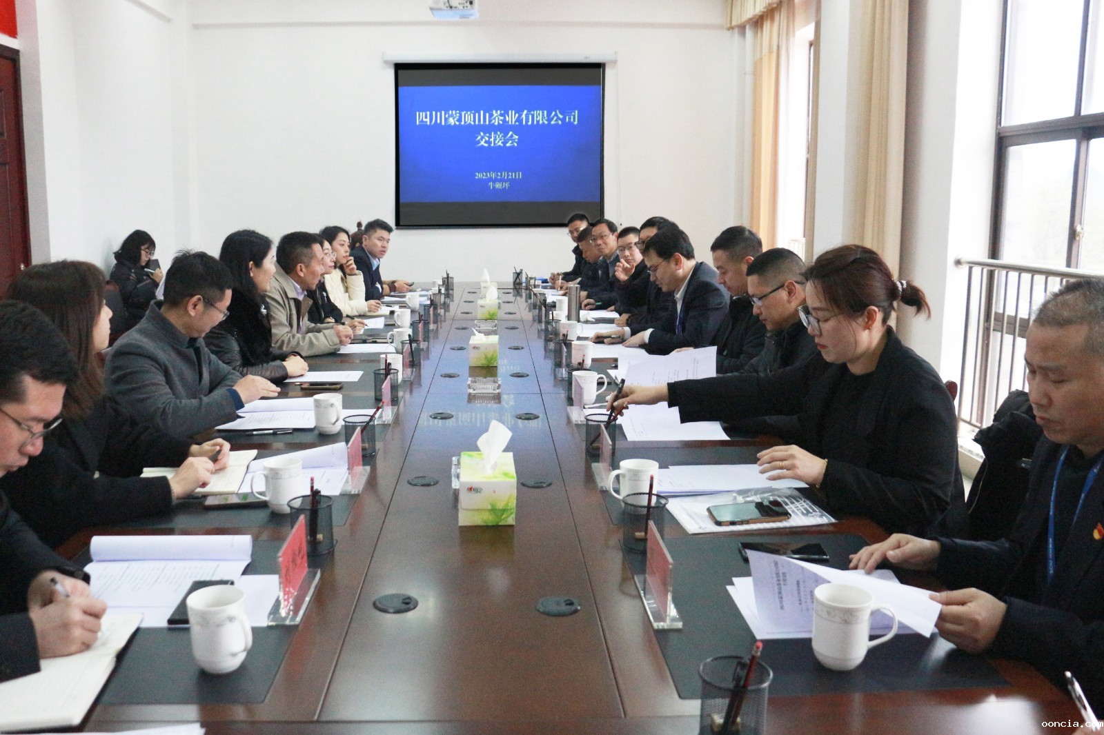 2023年2月21日上午,为加快股权划转落实落地、明确经营管理责任,房地产公司会同安逸酒店集团召开了蒙顶山茶业公司交接会。会议由房地产公司党总支组织宣传委员、财务总监李易亮主持,安逸酒店集团党委书记、董事长王兆学和房地产公司党总支书记、总经理王海洋出席本次交接会。
